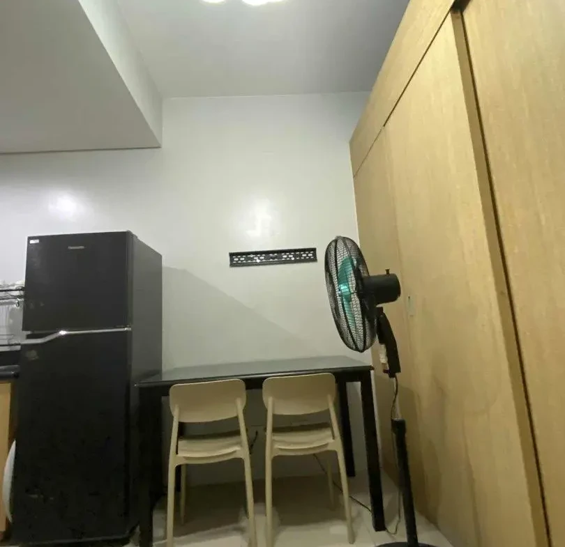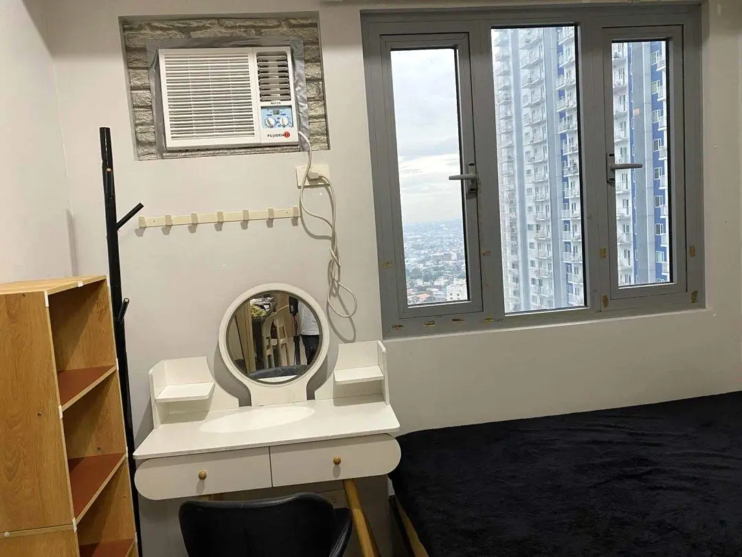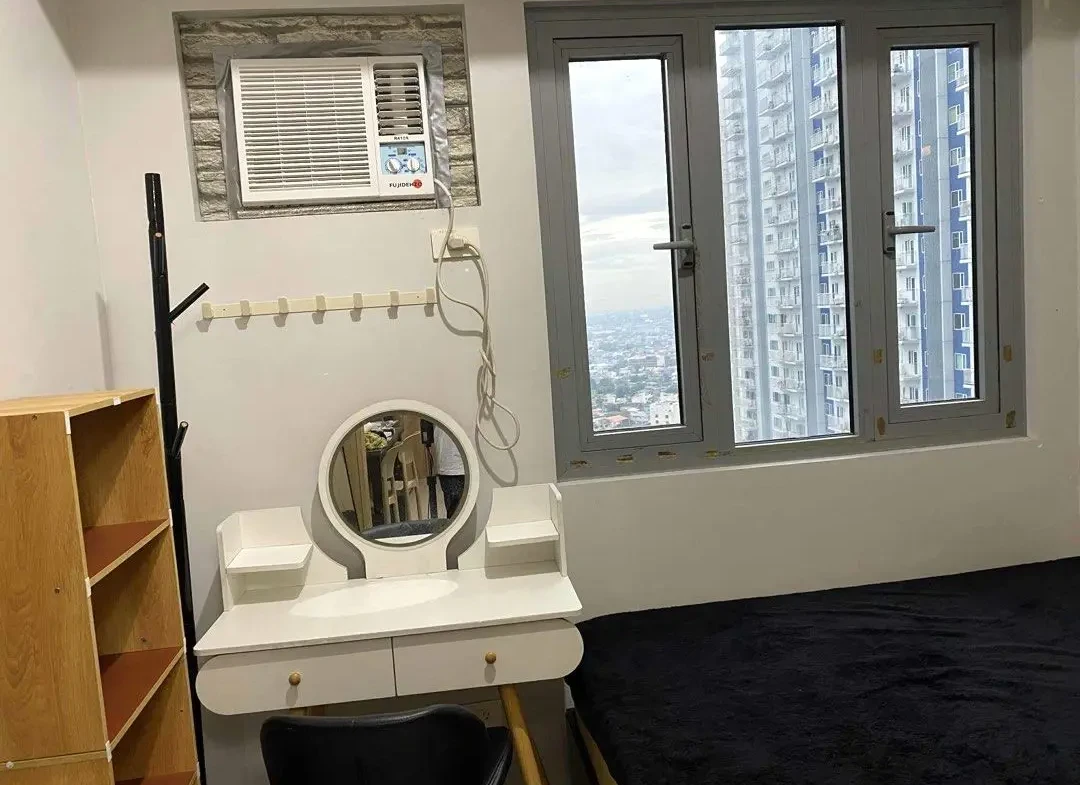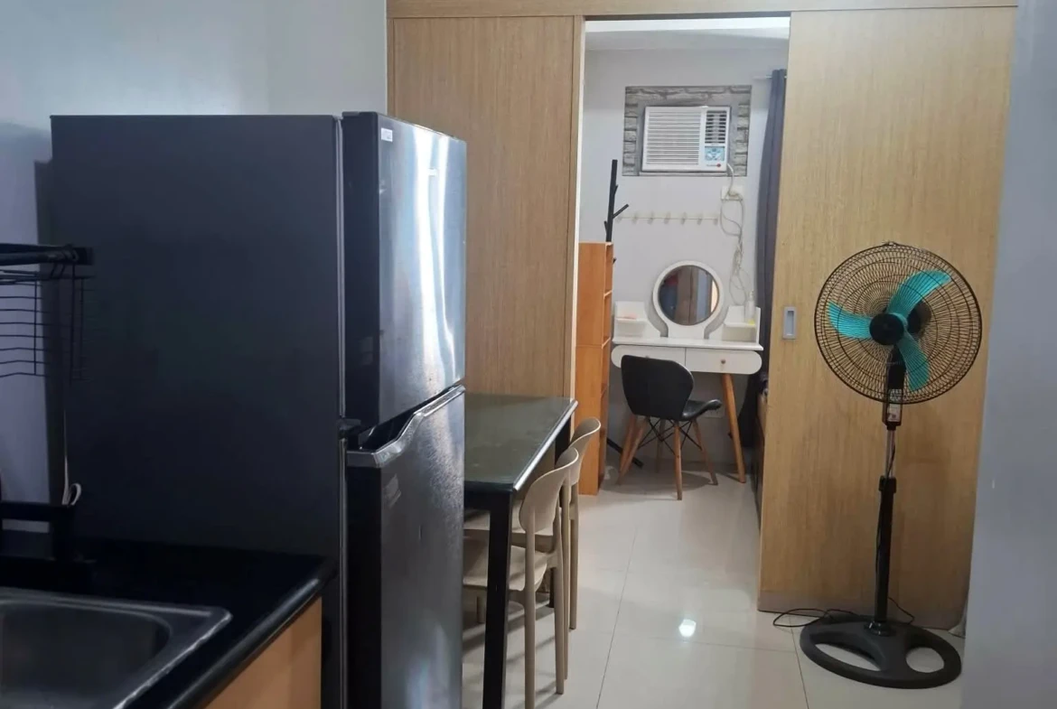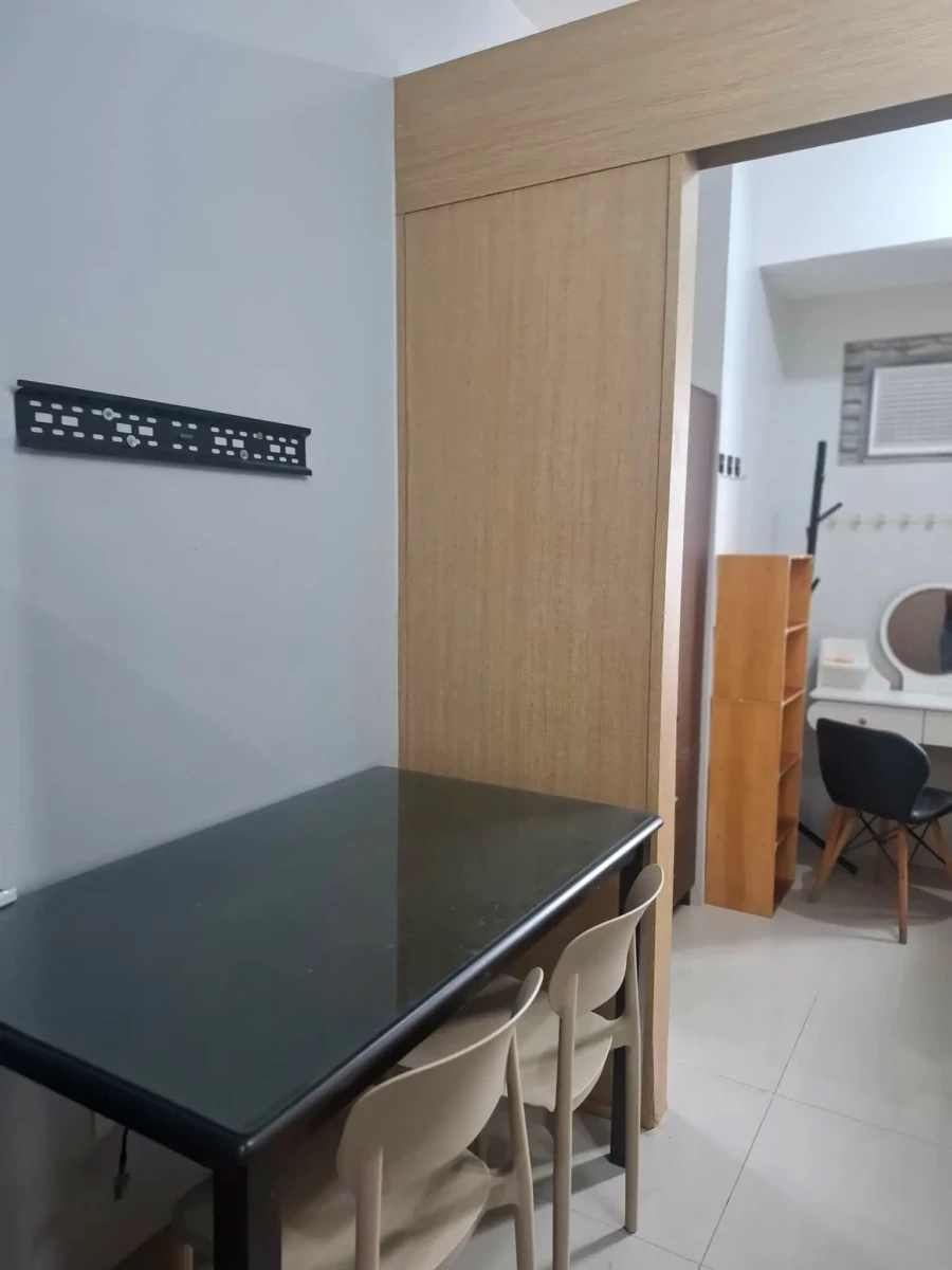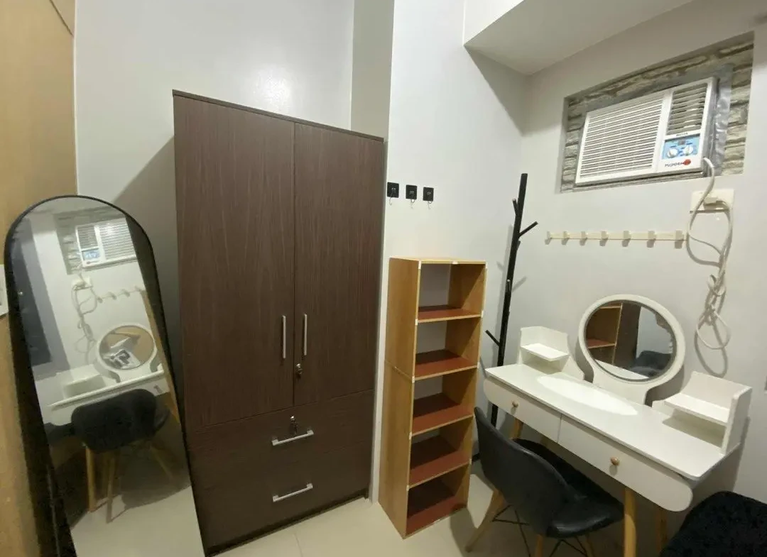 1 Bedroom facing amenities. Floor Area: 21 sqm. Fully Furnished with bed, aircon, inverter refrigerator, electric stand fan, sofa, clothes cabinet, shoe cabinet, vanity set with standing mirror, dining table, and hot shower