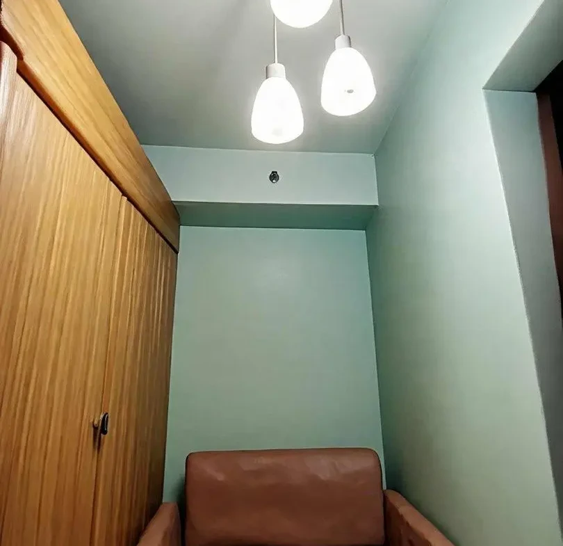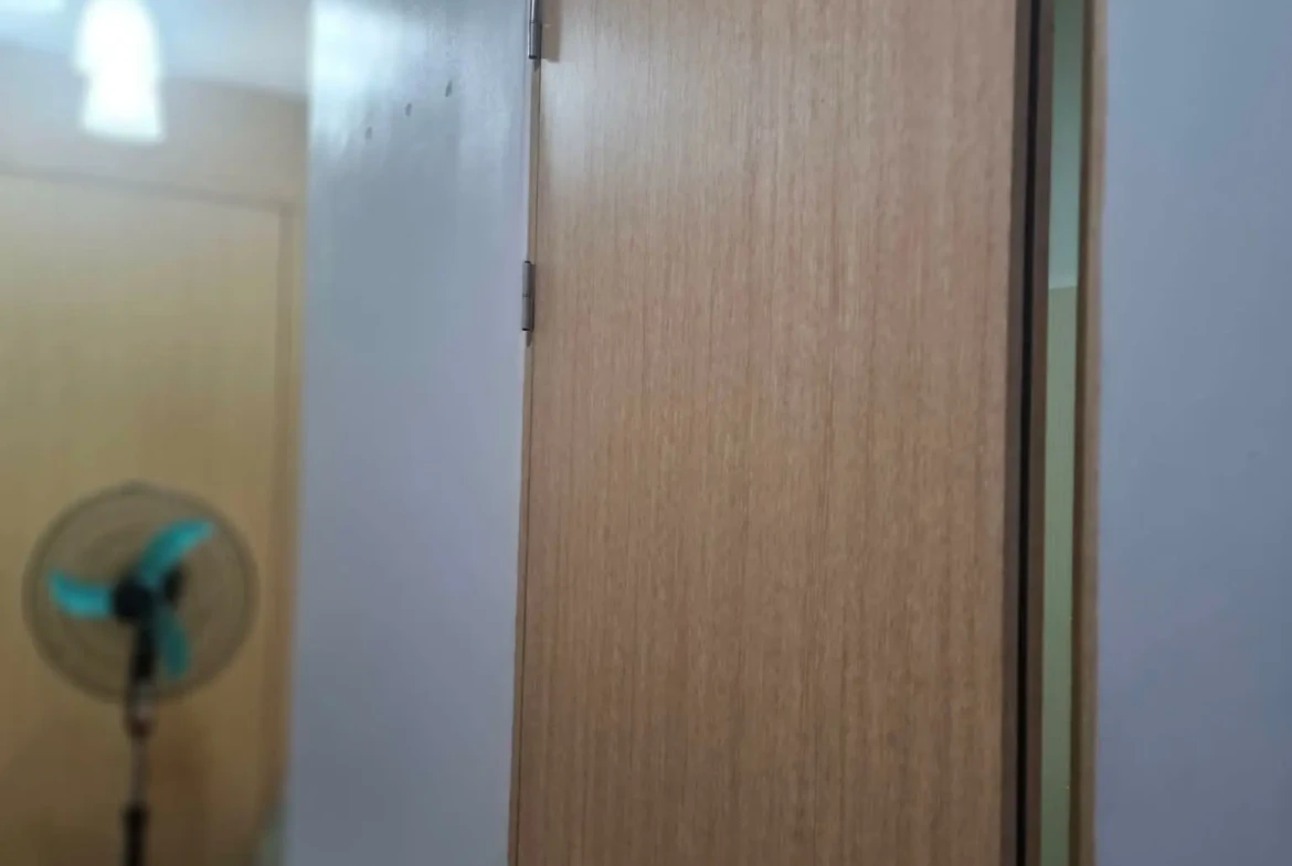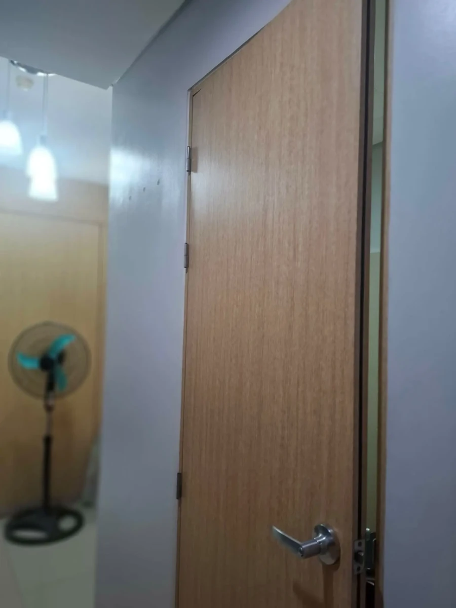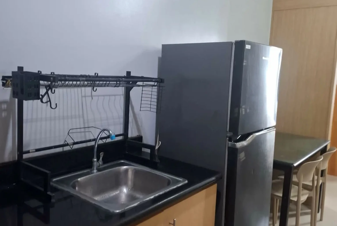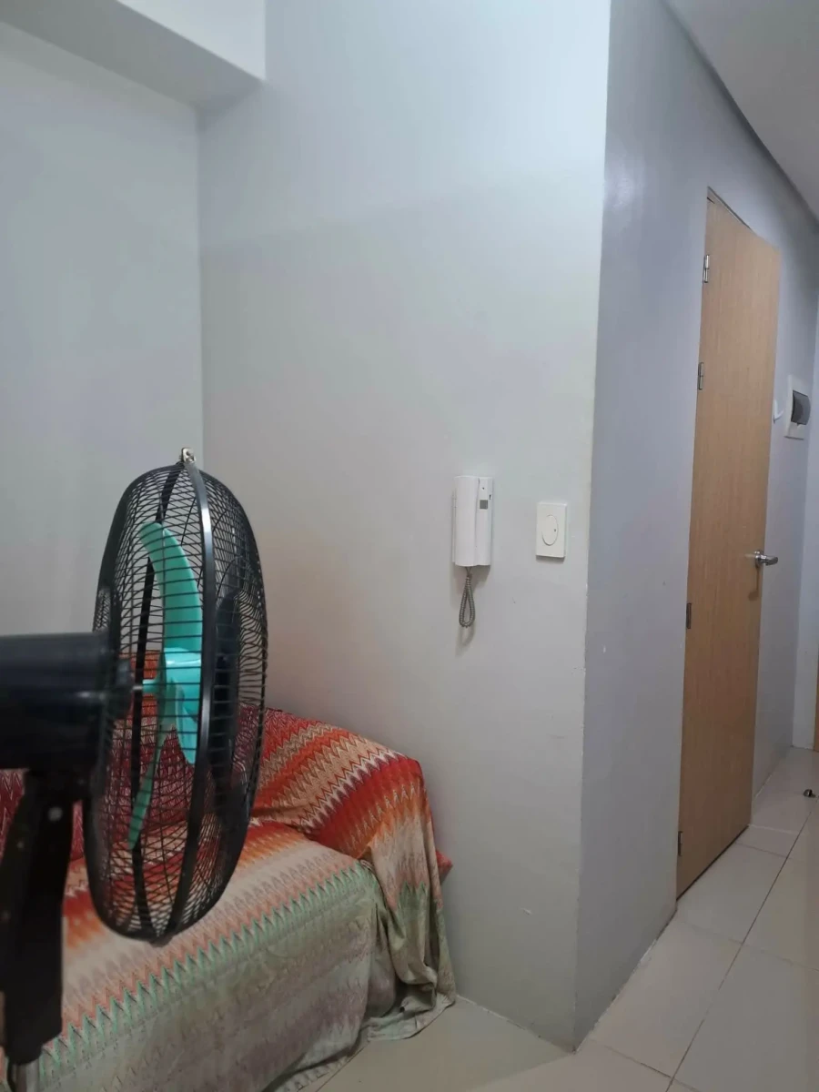 1 Bedroom facing amenities. Floor Area: 21 sqm. Fully Furnished with bed, aircon, inverter refrigerator, electric stand fan, sofa, clothes cabinet, shoe cabinet, vanity set with standing mirror, dining table, and hot shower